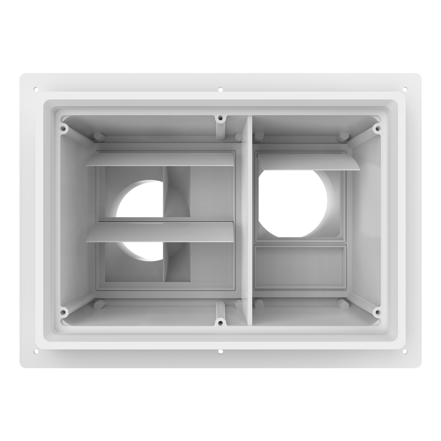 Double exhaust box with dual 4″ duct ports in a horizontal orientation. For use with brick/stone, EIFS, metal panel and stucco/siding greater than 5/8″ thick and similar exteriors. New adjustable mounting sleeve extends offset range from 1″- 9″. Includes an improved weather seal, gravity backdraft dampers and a separator fin which prevents exhaust from mingling inside the box. Can be customized to fit unique field conditions.