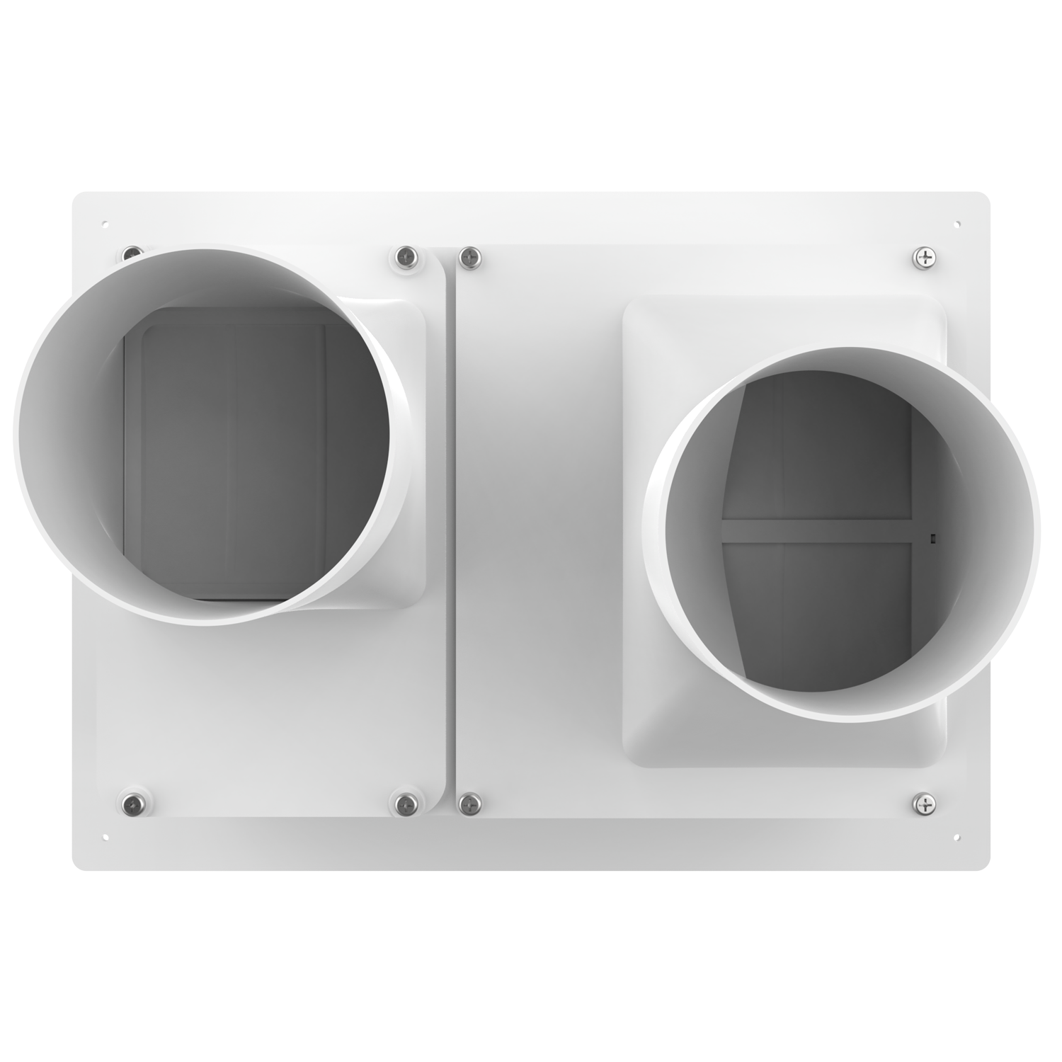 Double exhaust box with dual 4″ duct ports in a horizontal orientation. For use with stucco/siding and similar exteriors less than 5/8″ thick. Includes gravity backdraft dampers and a separator fin which prevents exhaust from mingling inside the box. Can be customized to fit unique field conditions.