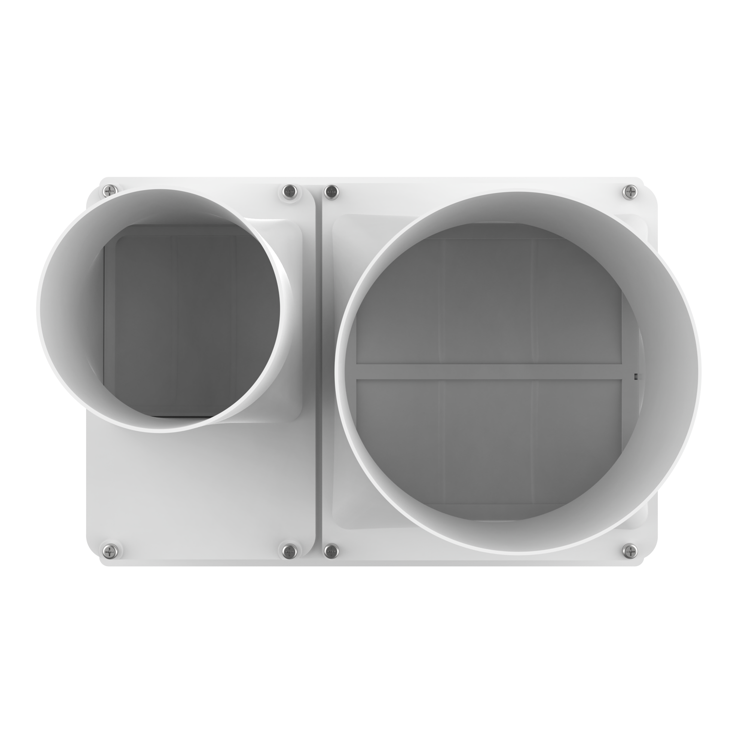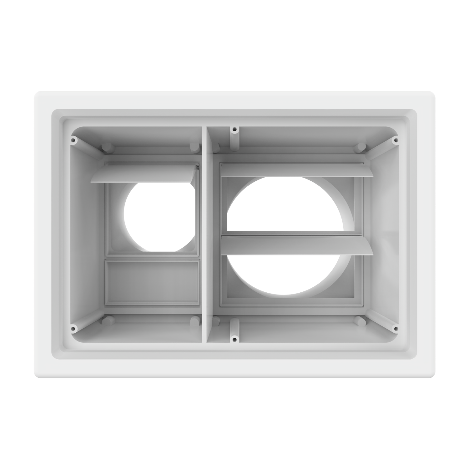 Double exhaust box with 6″ and 4″ duct ports in a horizontal orientation. 4″ port is located on the left side when viewing the box from the front. For use with precast concrete, aluminum panel and similar exteriors. Includes gravity backdraft dampers, mounting straps and a separator fin which prevents exhaust from mingling inside the box. Can be customized to fit unique field conditions.
