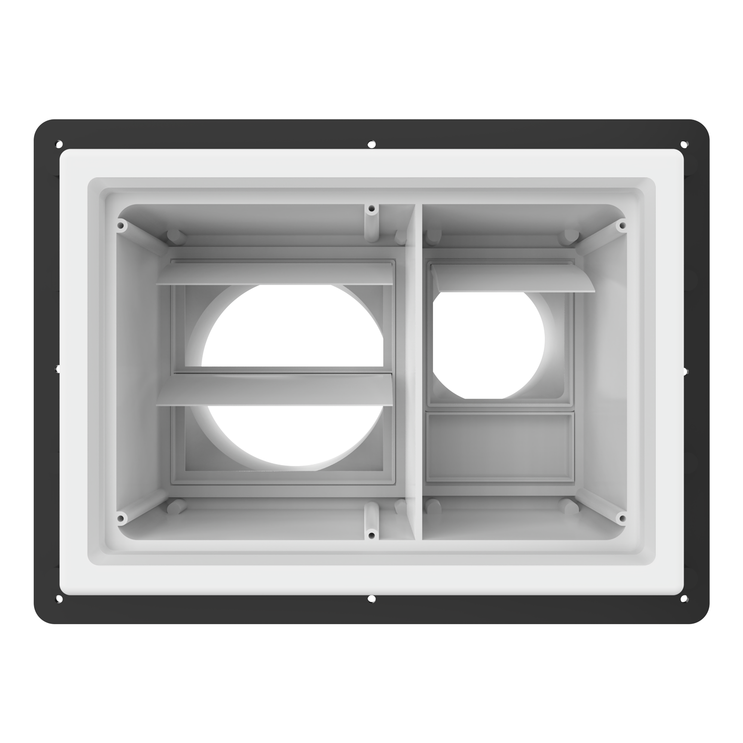 Double exhaust box with 6″ and 4″ duct ports in a horizontal orientation. 4″ port is located on the right side when viewing the box from the front. For use with glass curtain wall, glazing/composite panel systems and similar exteriors. Includes compression plate mounting flange, gravity backdraft dampers and a separator fin which prevents exhaust from mingling inside the box. Can be customized to fit unique field conditions.