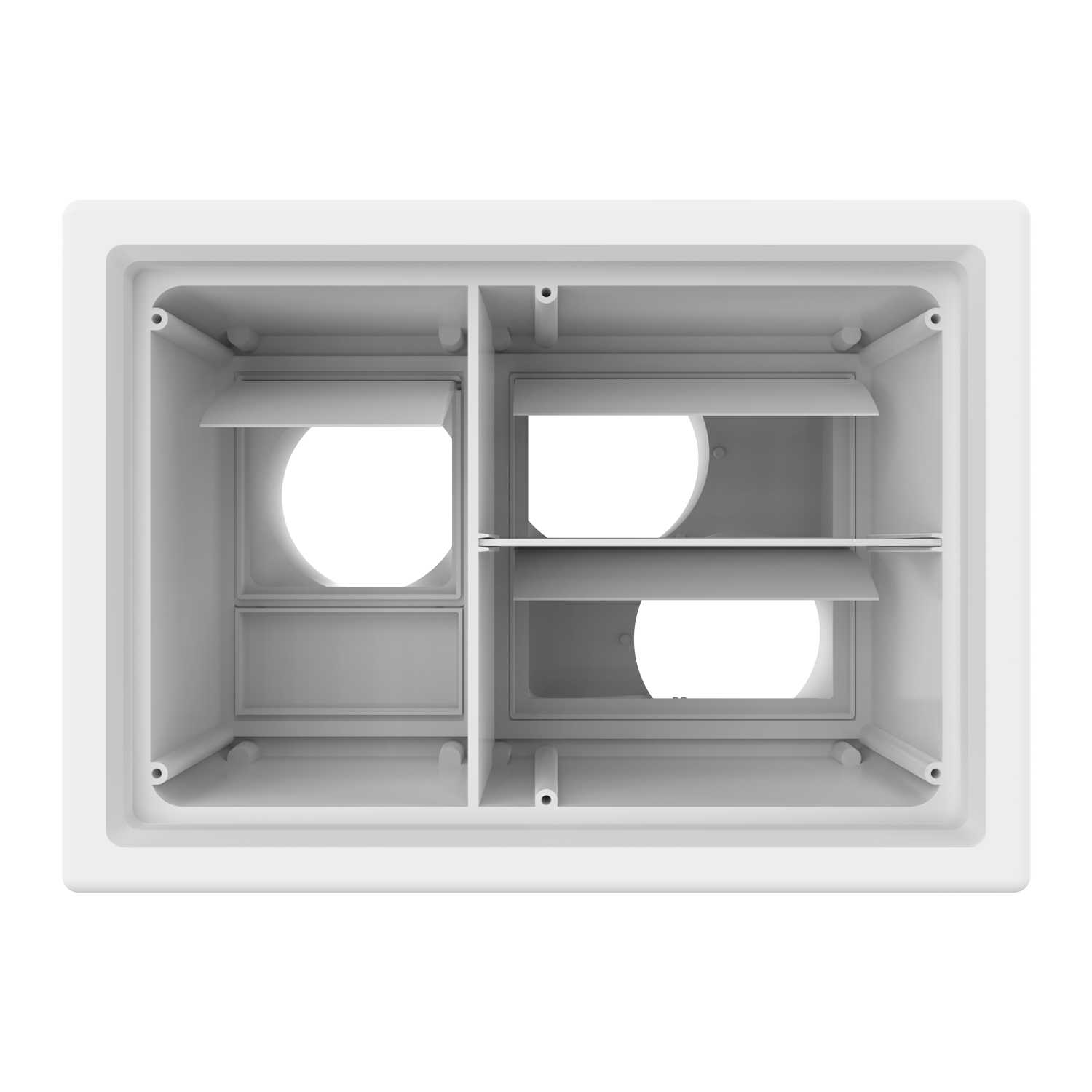 Triple exhaust box with three 4″ duct ports in a horizontal orientation. For use with precast concrete, aluminum panel and similar exteriors. Includes gravity backdraft dampers, mounting straps and separator fins which prevent exhaust from mingling inside the box. Can be customized to fit unique field conditions.
