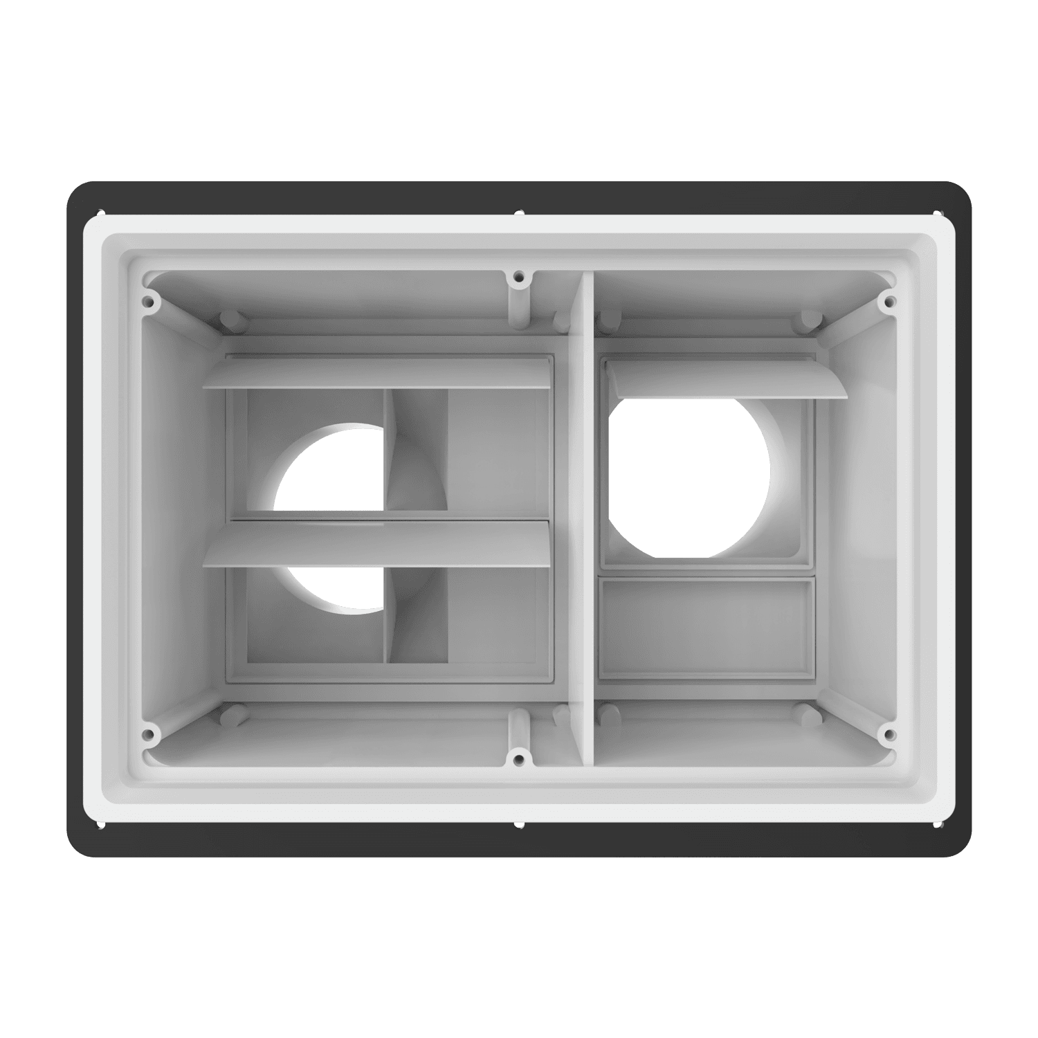 Double exhaust box with dual 4″ duct ports in a horizontal orientation. For use with brick/stone, EIFS, metal panel, stucco/siding greater than 7/8″ thick and similar exteriors. Includes adjustable mounting flange with an offset range of 1″-6″, gravity backdraft dampers and a separator fin which prevents exhaust from mingling inside the box. Can be customized to fit unique field conditions.