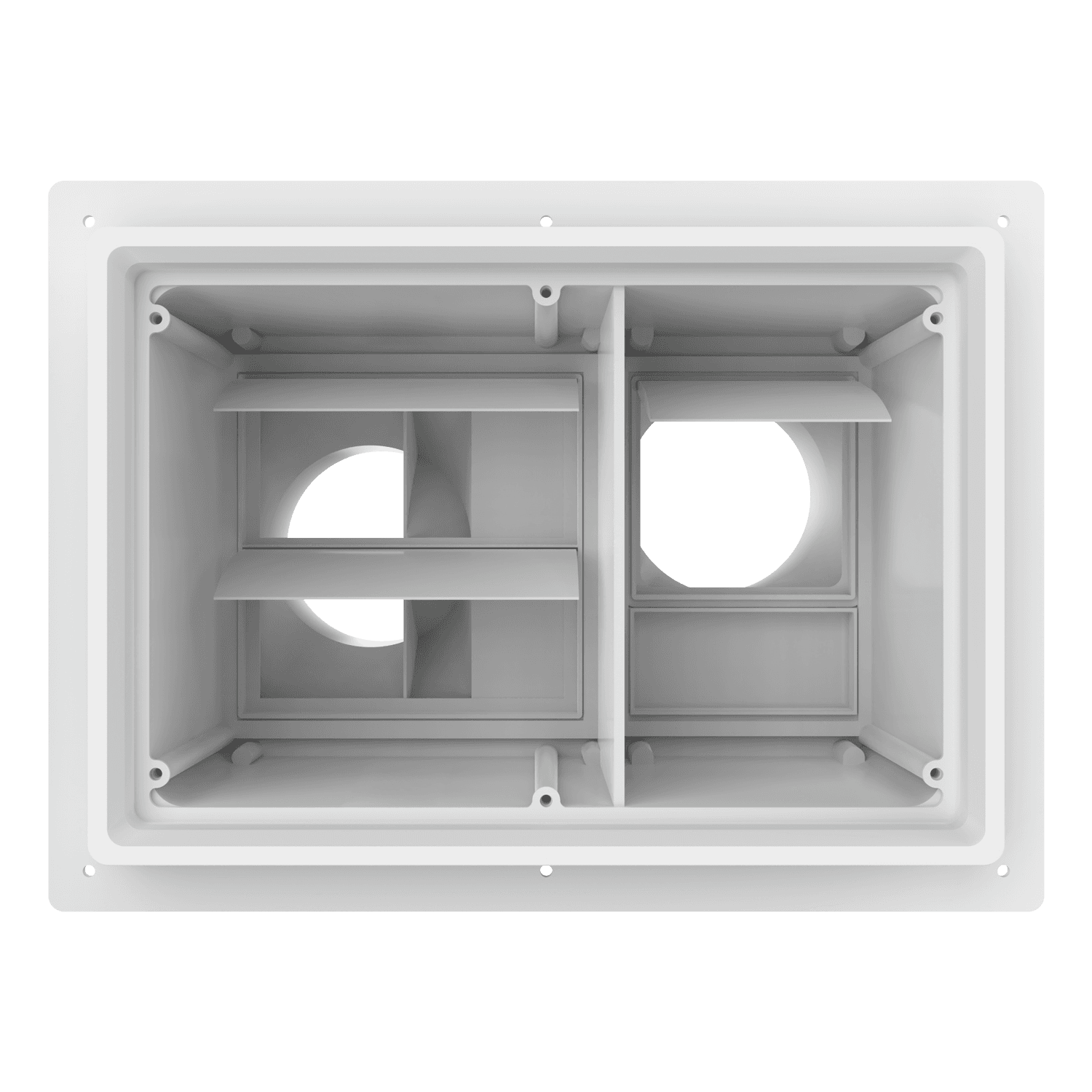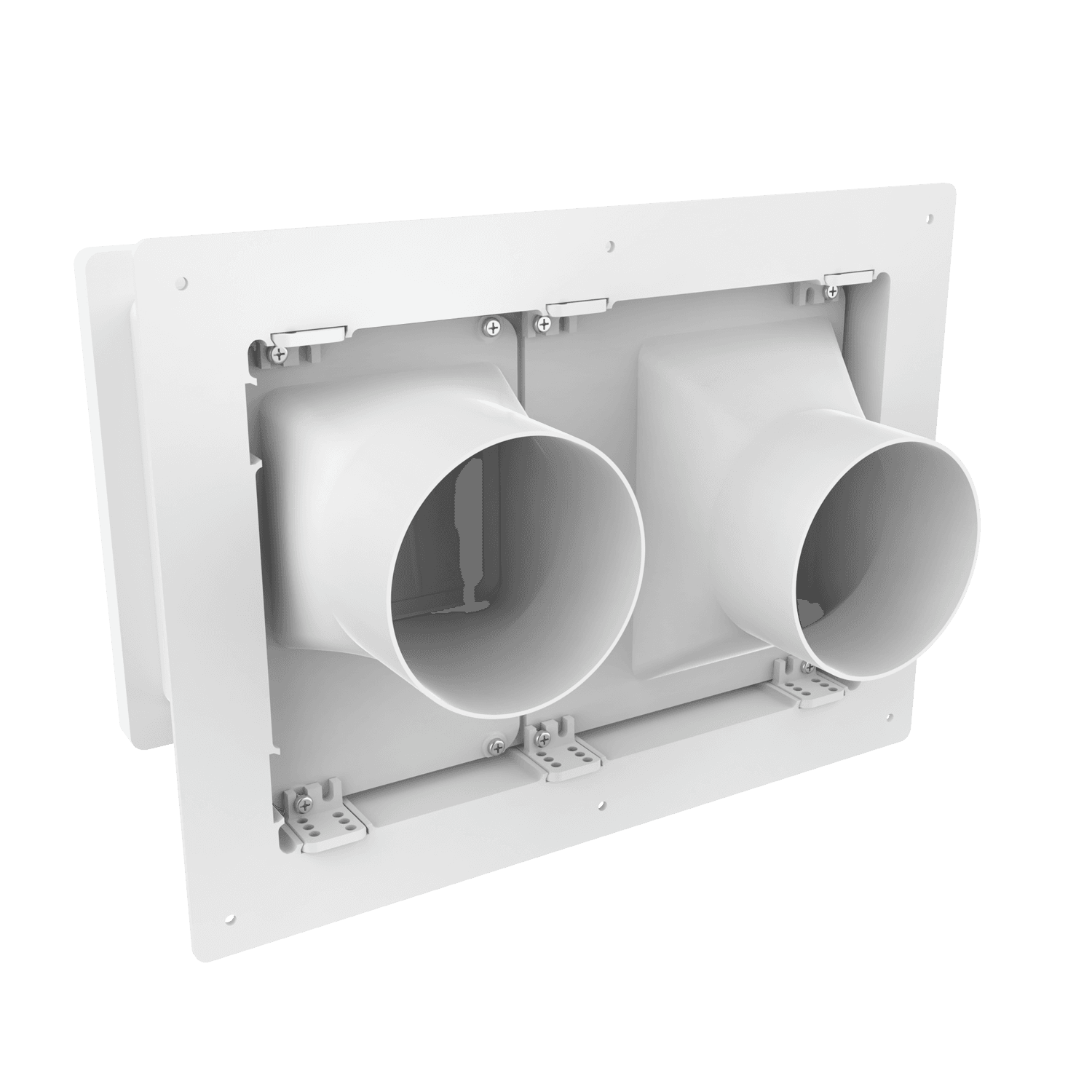 Double exhaust box with dual 4″ duct ports in a horizontal orientation. For use with stucco/siding and similar exteriors less than 5/8″ thick. Includes gravity backdraft dampers and a separator fin which prevents exhaust from mingling inside the box. Can be customized to fit unique field conditions.