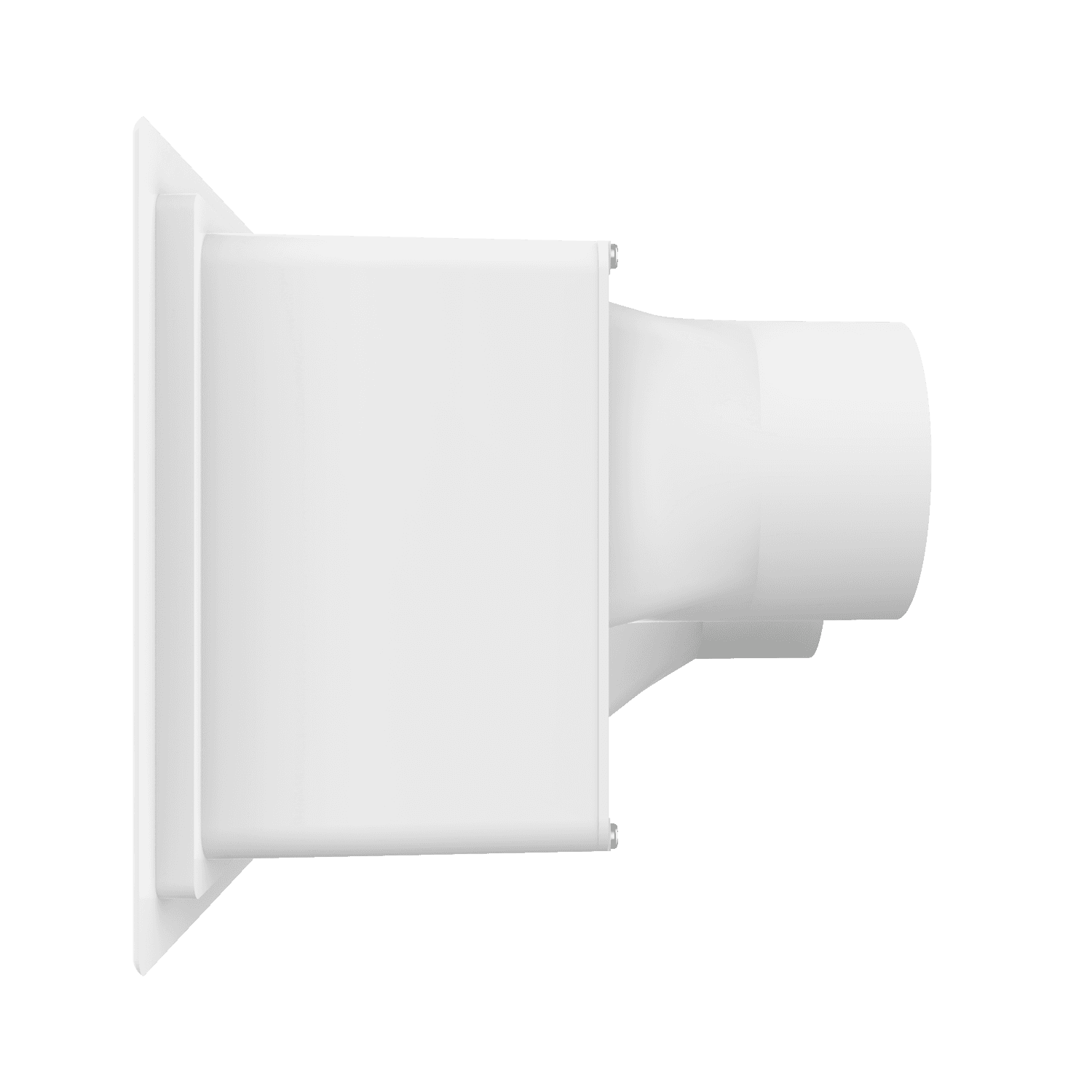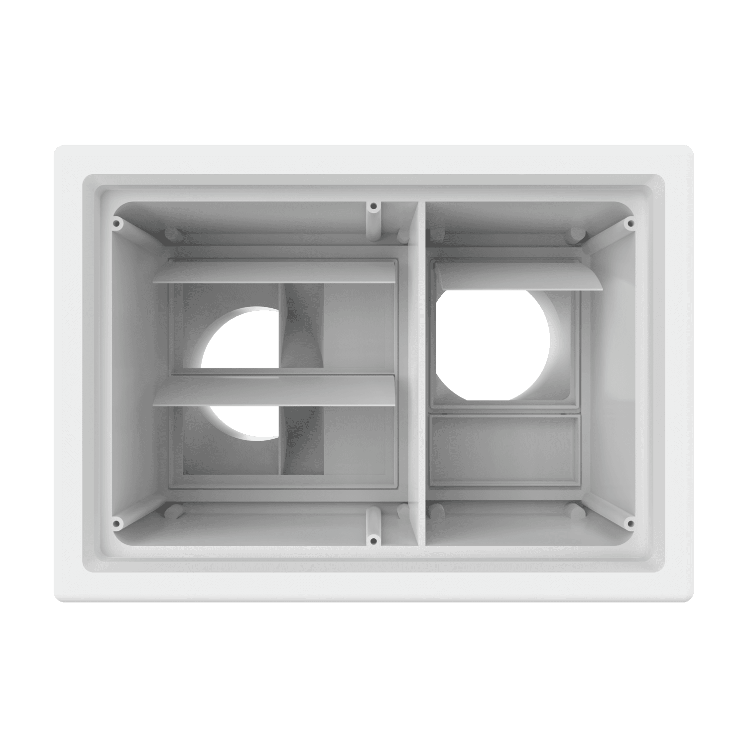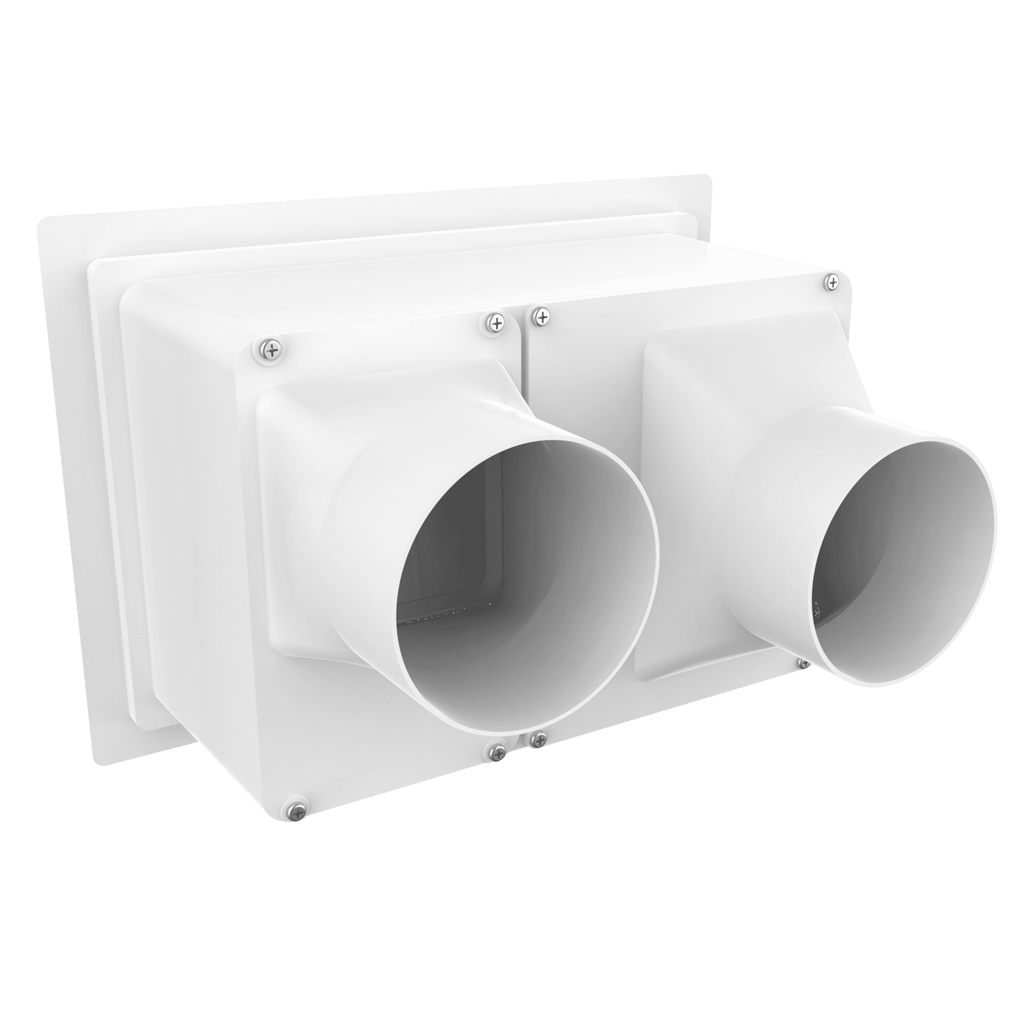 Double exhaust box with dual 4″ duct ports in a horizontal orientation. For use with precast concrete, aluminum panel and similar exteriors. Includes gravity backdraft dampers, mounting straps and a separator fin which prevents exhaust from mingling inside the box. Can be customized to fit unique field conditions.