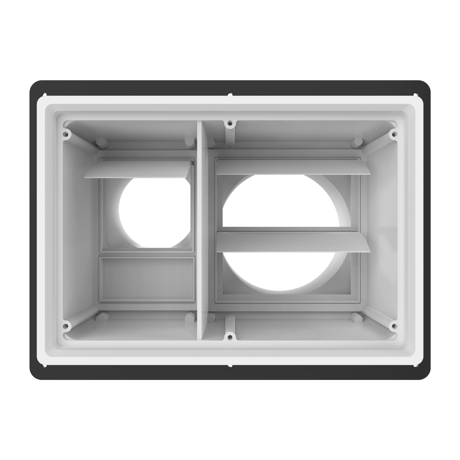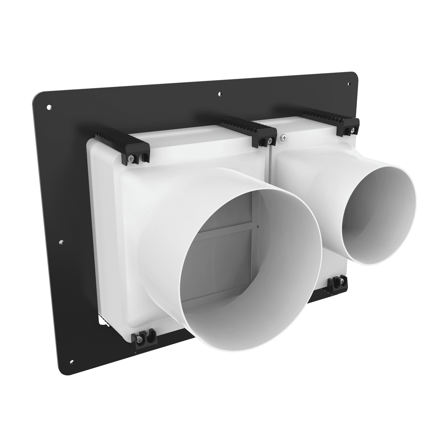 Double exhaust box with 6″ and 4″ duct ports in a horizontal orientation. 4″ port is located on the left side when viewing the box from the front. For use with brick/stone, EIFS, metal panel and stucco/siding greater than 7/8″ thick and similar exteriors. Includes adjustable mounting flange with an offset range of 1″-6″, gravity backdraft dampers and a separator fin which prevents exhaust from mingling inside the box.. Can be customized to fit unique field conditions.