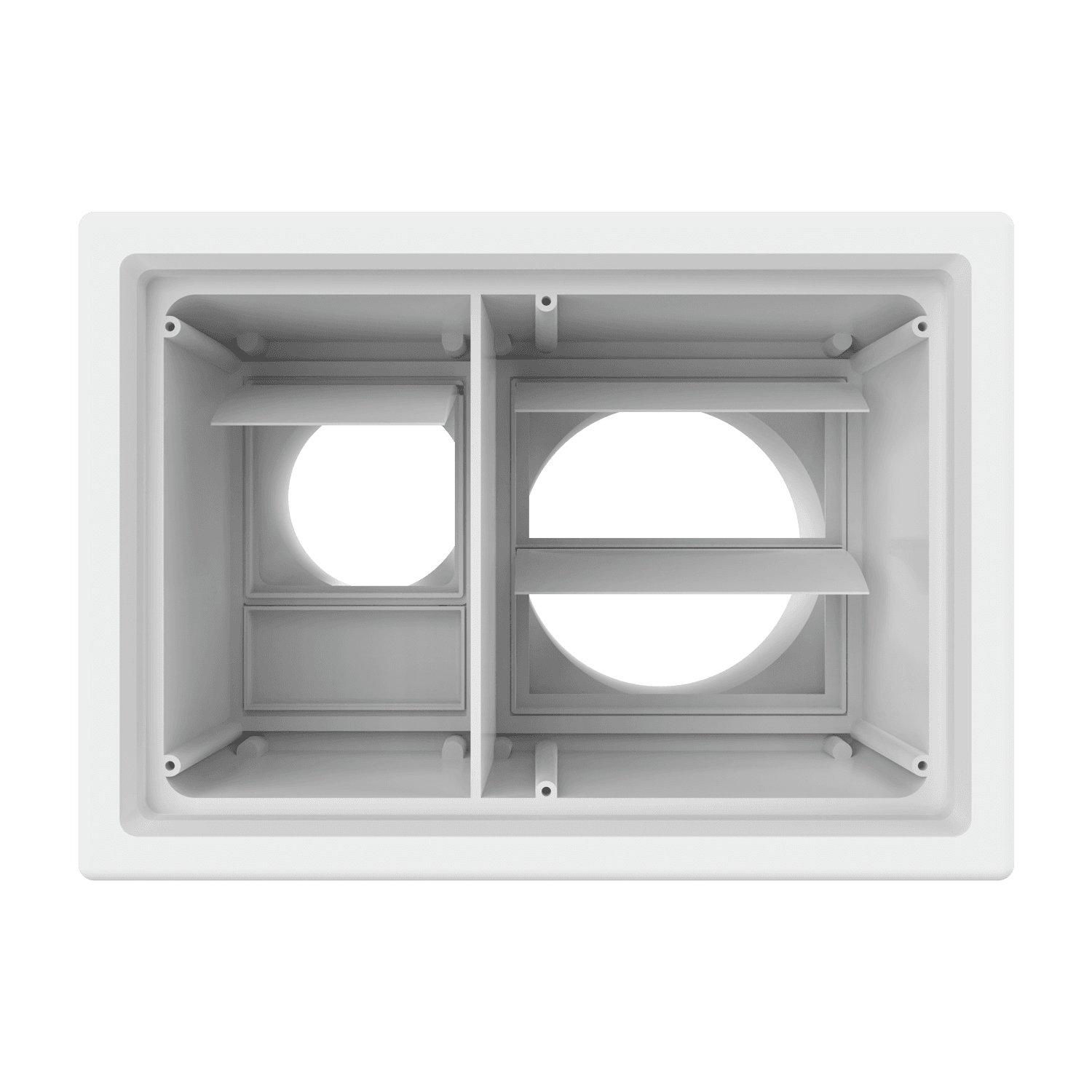Double exhaust box with 6″ and 4″ duct ports in a horizontal orientation. 4″ port is located on the left side when viewing the box from the front. For use with precast concrete, aluminum panel and similar exteriors. Includes gravity backdraft dampers, mounting straps and a separator fin which prevents exhaust from mingling inside the box. Can be customized to fit unique field conditions.