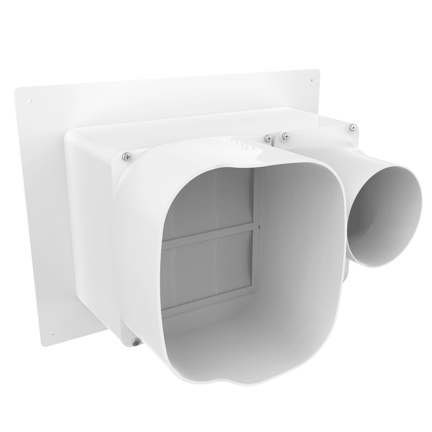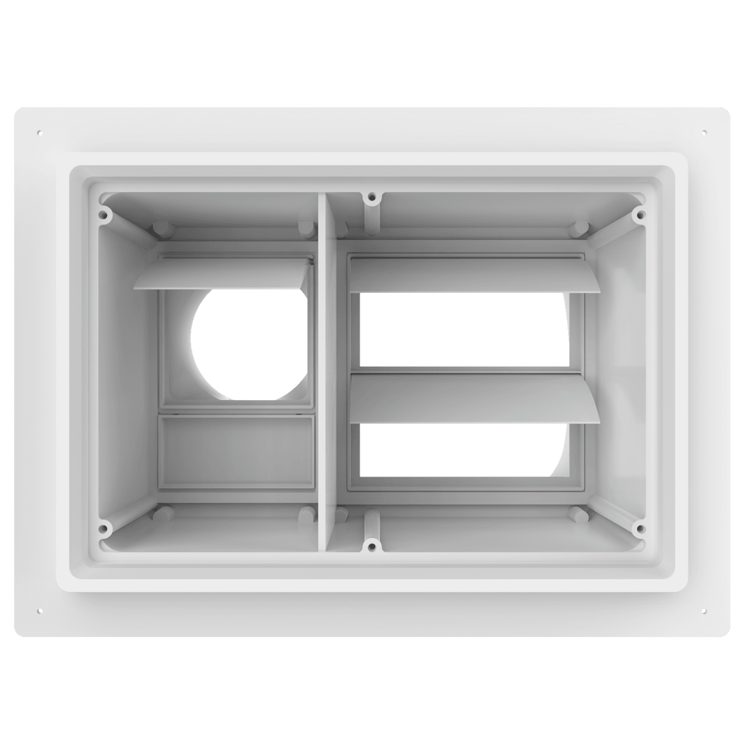 Double exhaust box with 8″ and 4″ duct ports in a horizontal orientation. 4″ port is located on the left side when viewing the box from the front. For use with stucco/siding and similar exteriors less than 7/8″ thick. Includes gravity backdraft dampers and a separator fin which prevents exhaust from mingling inside the box. Can be customized to fit unique field conditions.