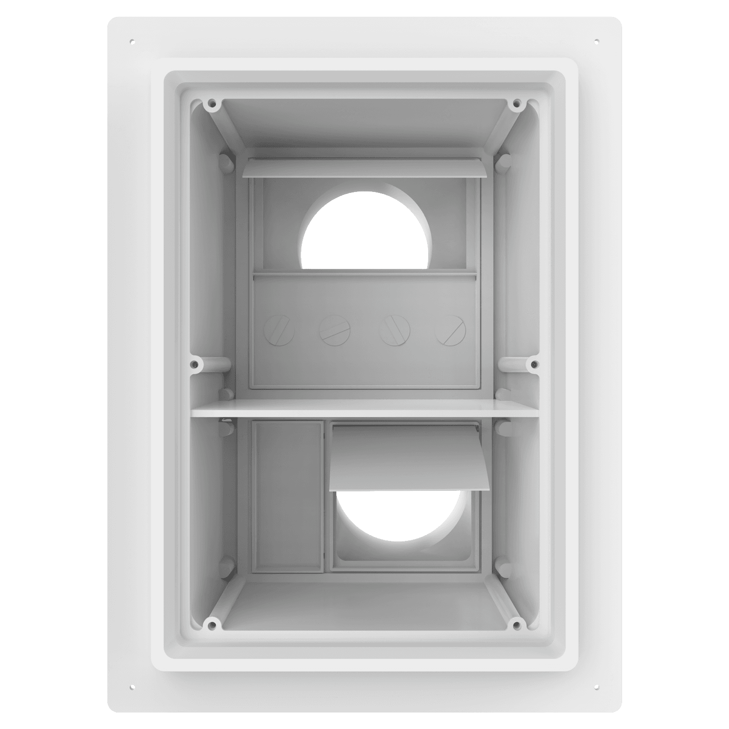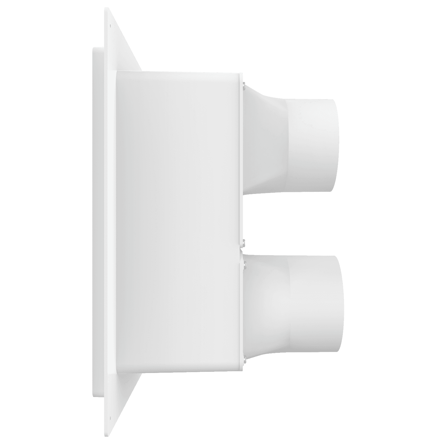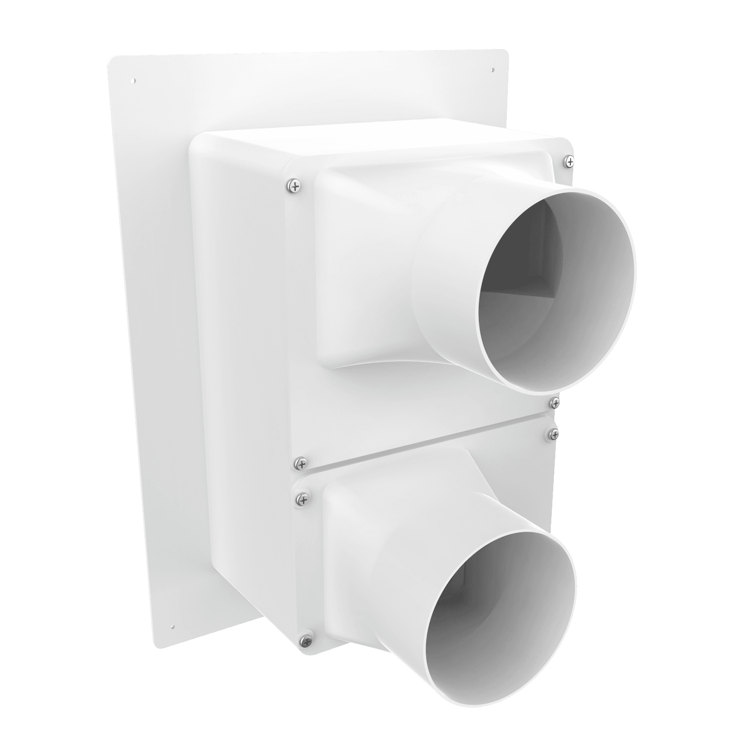 Double exhaust box with dual 4″ duct ports in a vertical orientation. For use with stucco/siding and similar exteriors less than 7/8″ thick. Includes gravity backdraft dampers and a separator fin which prevents exhaust from mingling inside the box. Can be customized to fit unique field conditions.