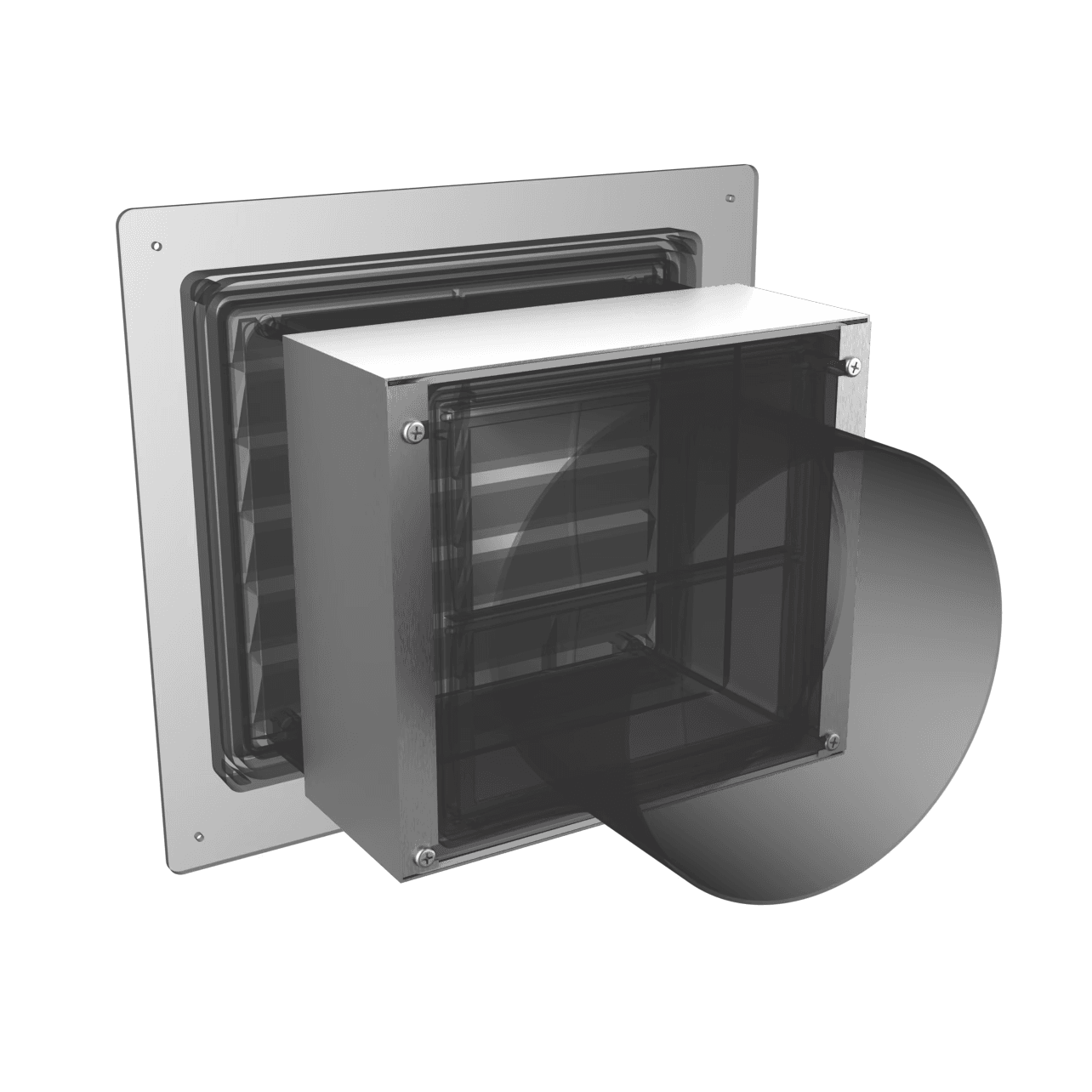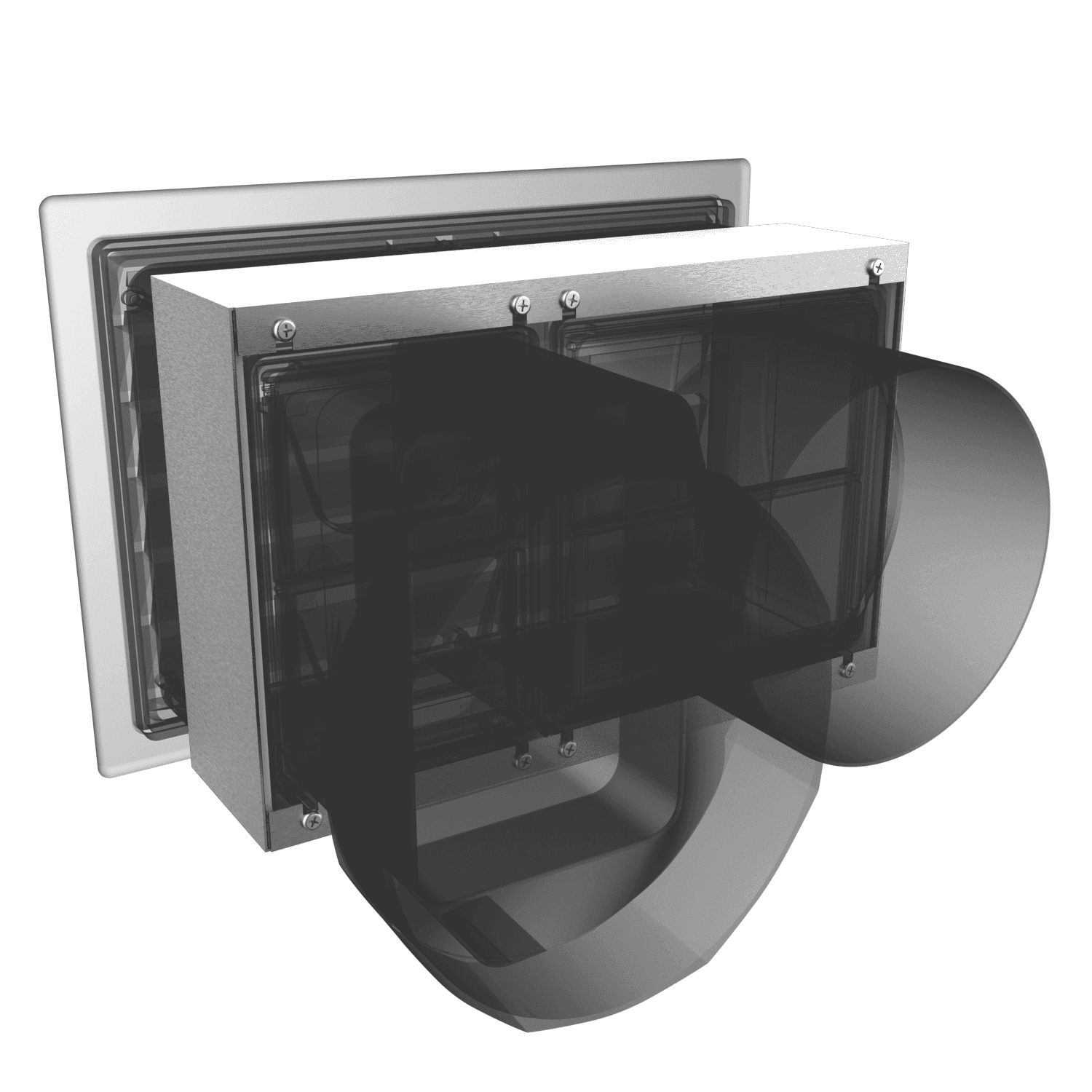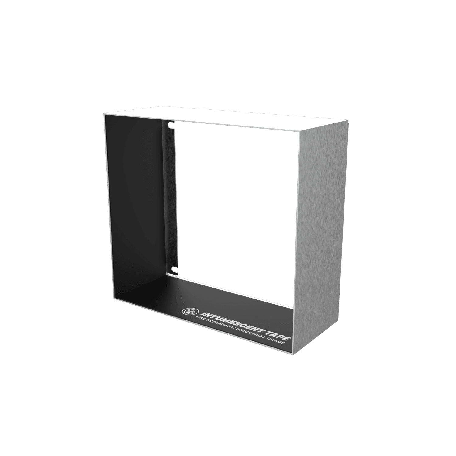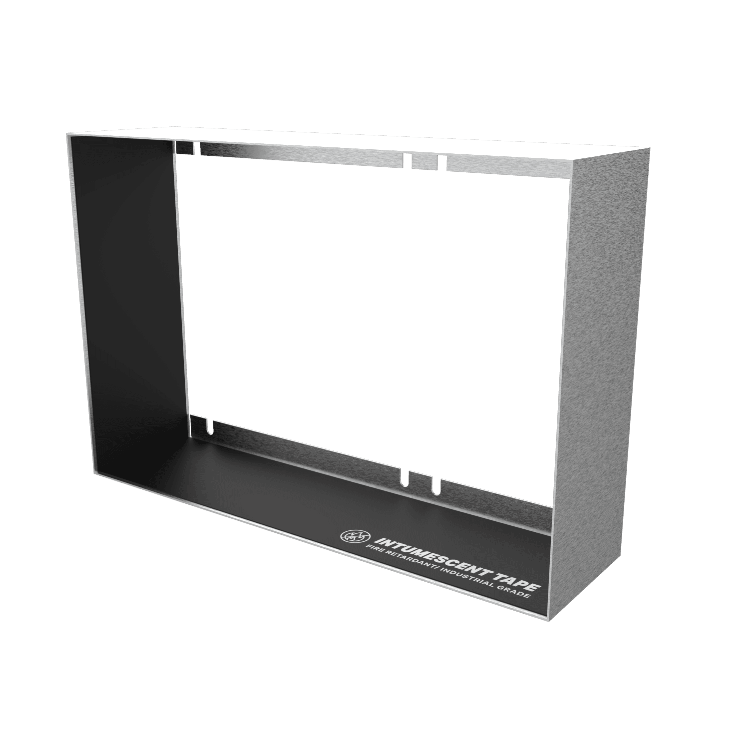 In a Fire Rated XVent Box, the exhaust box is encased in a 20 GA steel metal housing that is custom ordered to provide adjustable flange for mounting with a depth varying from 3-in to 6-in. accommodating an offset distance between 1-in. and 6-in. The Fire Rated XVent Box incorporates three layers of a 3-in. wide and 2mm thick proprietary intumescent pad around the perimeter between the metal housing and plastic exhaust box.