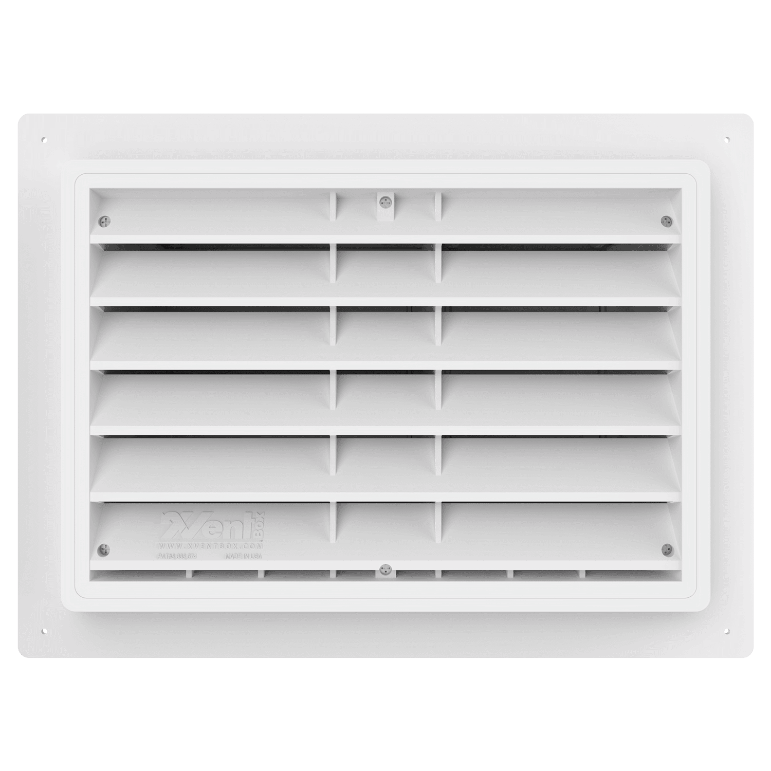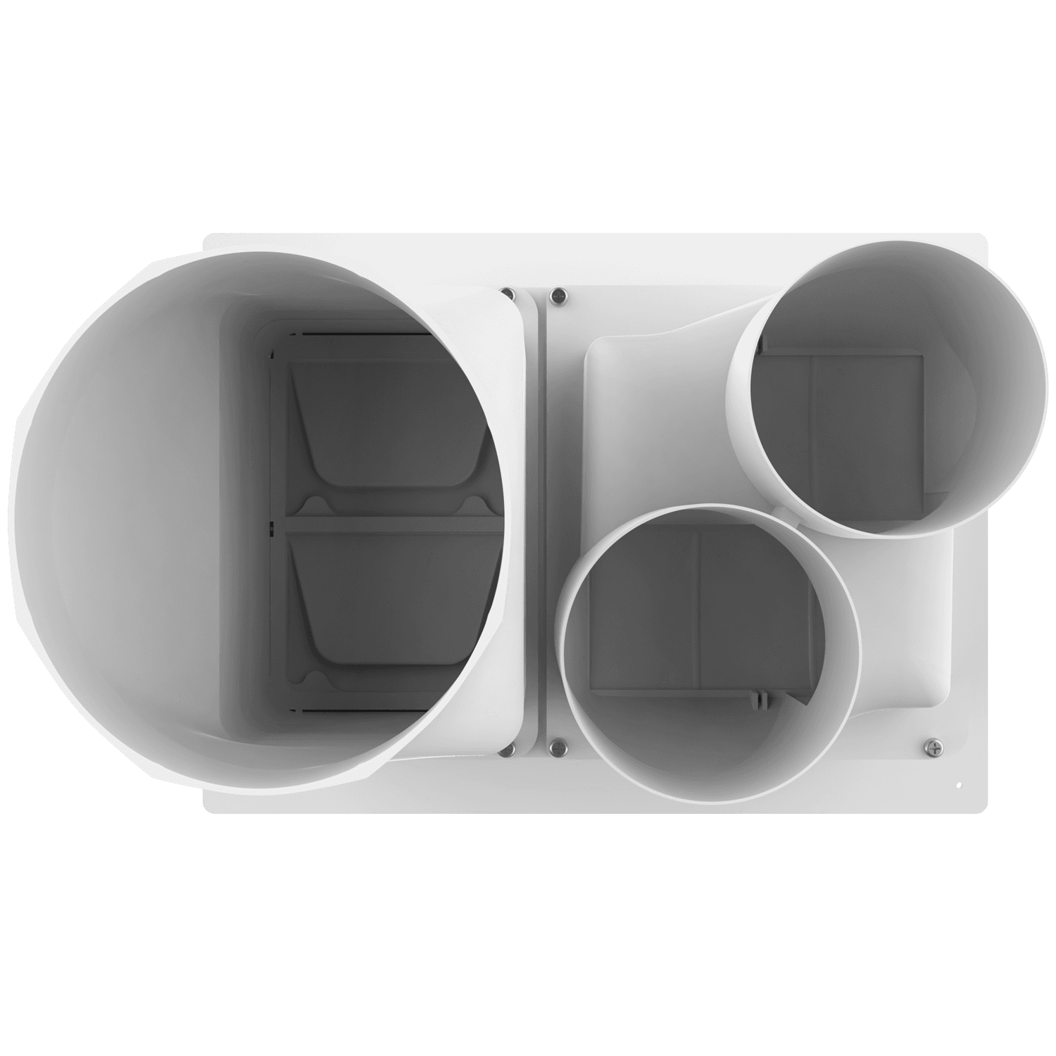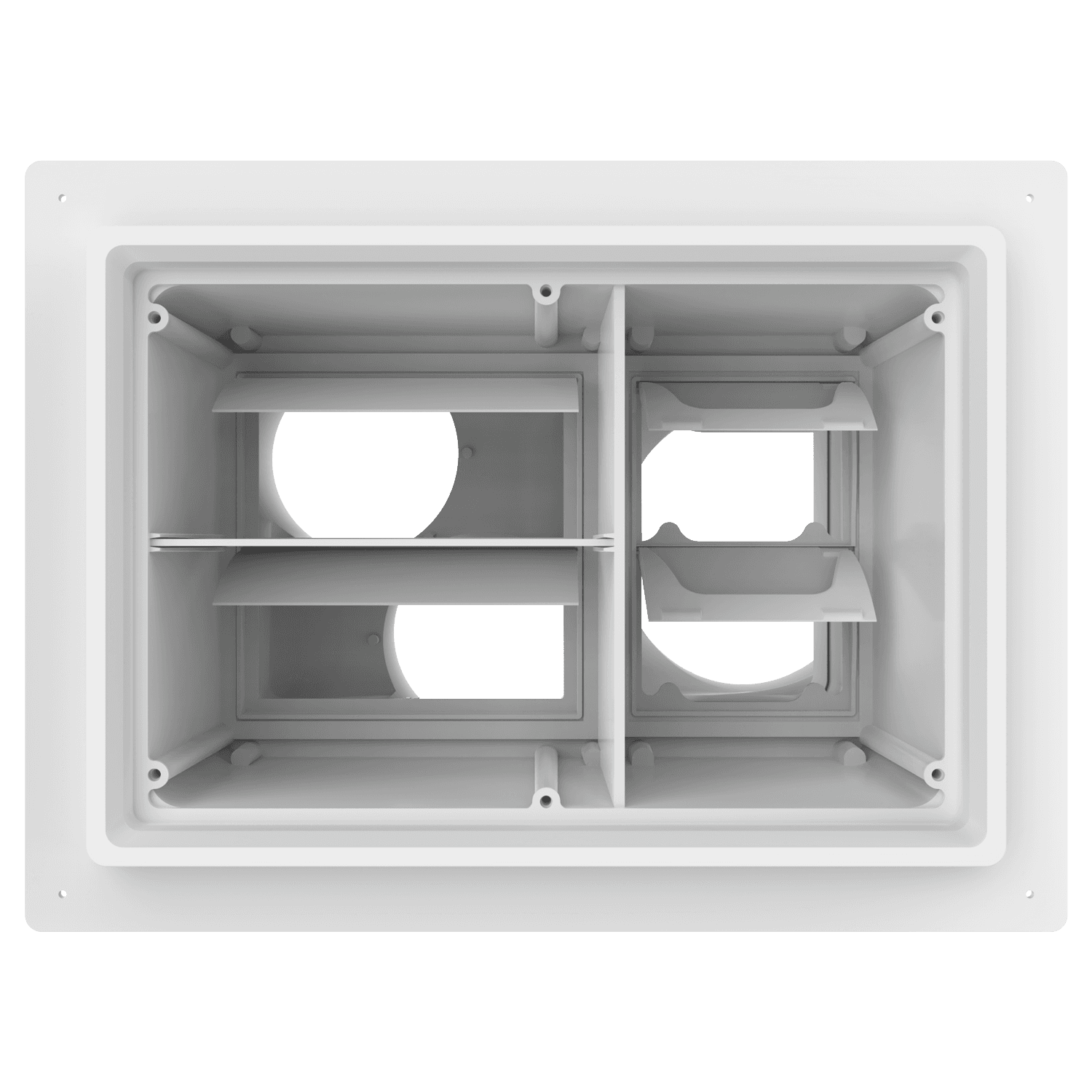 Triple exhaust box with dual 4″ and single 6″ duct ports in a horizontal orientation. 6″ port is located on the right side when viewing the box from the front. Features a fixed mounting flange ideal for use with stucco/siding and similar exteriors less than or equal to 7/8″ thick. Includes gravity backdraft dampers and a separator fin which prevents exhaust from mingling inside the box. Can be customized to fit unique field conditions.