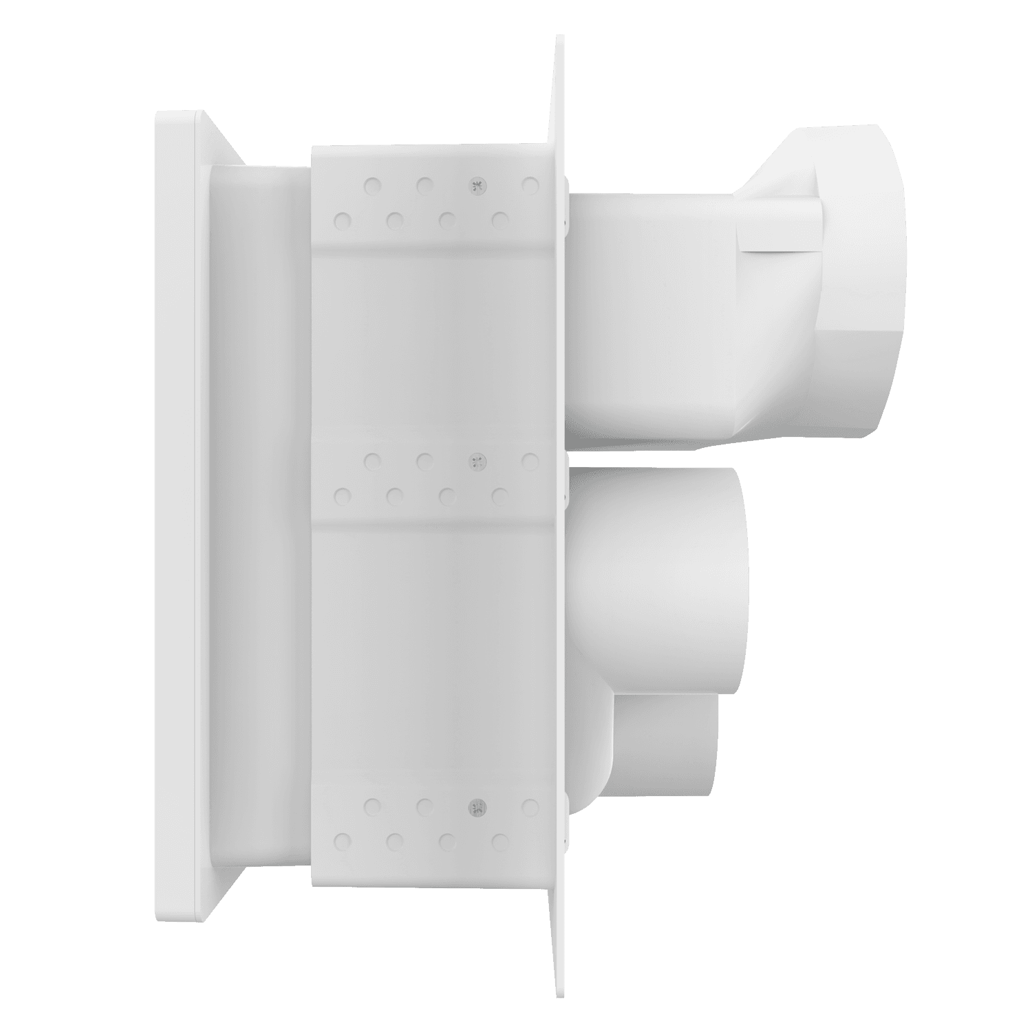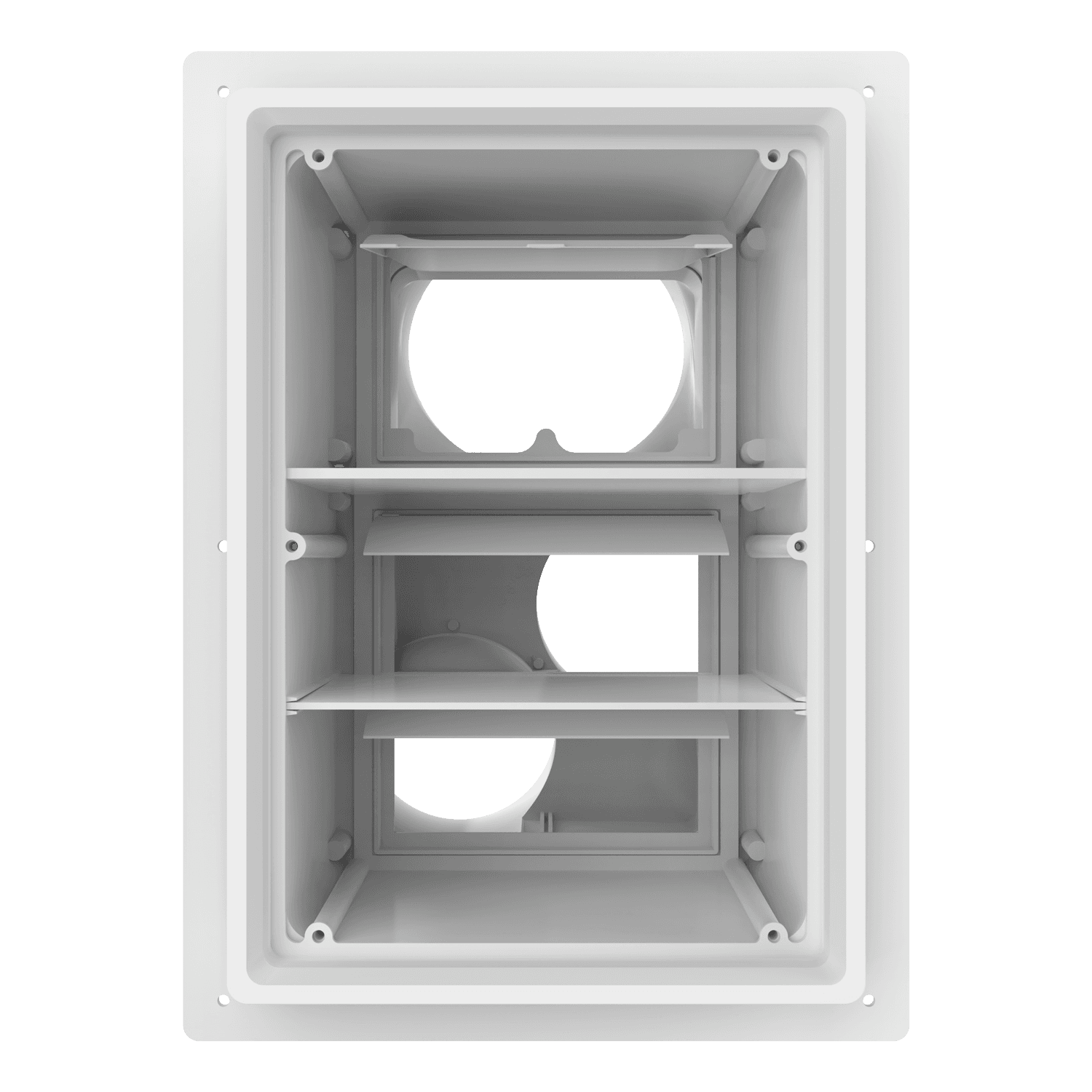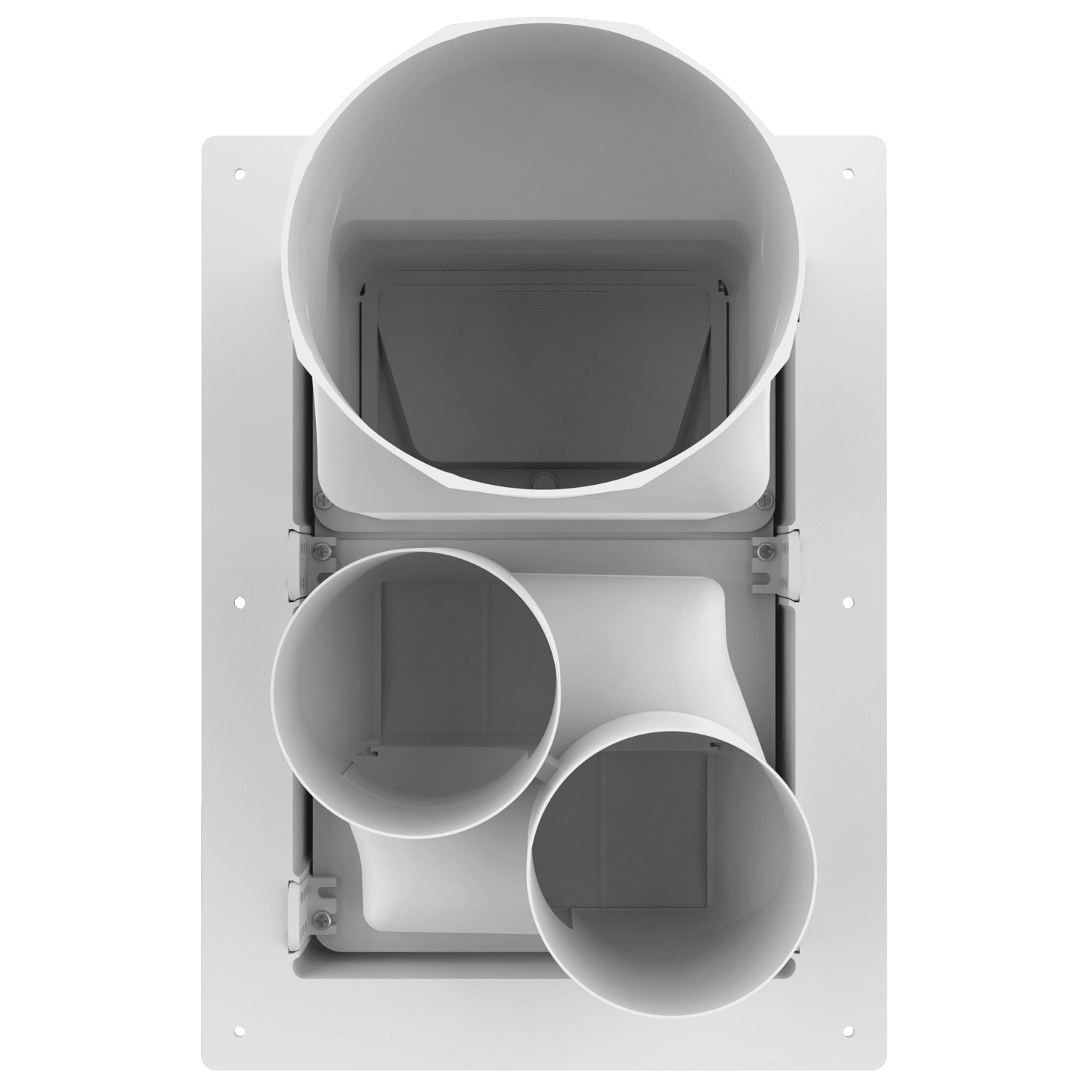 Triple exhaust box with dual 4″ and single 6″ duct ports in a vertical orientation. 6″ port is located at the top of the box. Features an adjustable mounting sleeve with an offset range from 1″- 9”, ideal for use with brick/stone, EIFS, corrugated metal panel, stucco/siding greater than 7/8″ thick and similar exteriors. Includes gravity backdraft dampers and a separator fin which prevents exhaust from mingling inside the box. Can be customized to fit unique field conditions.