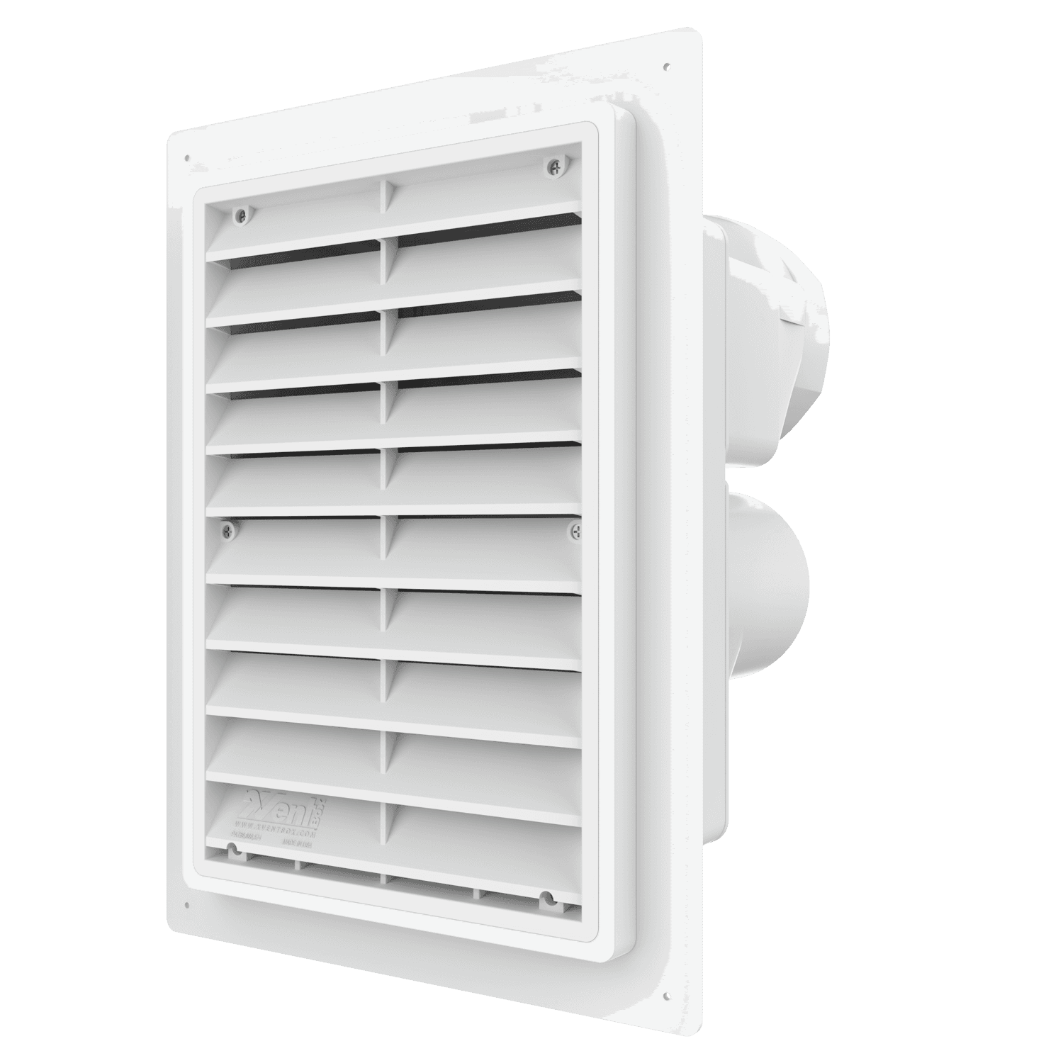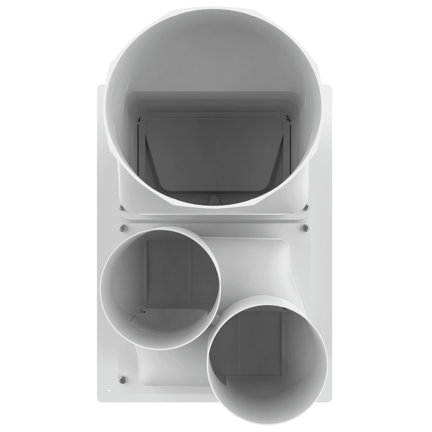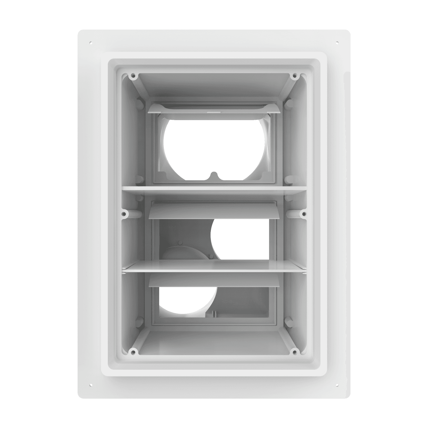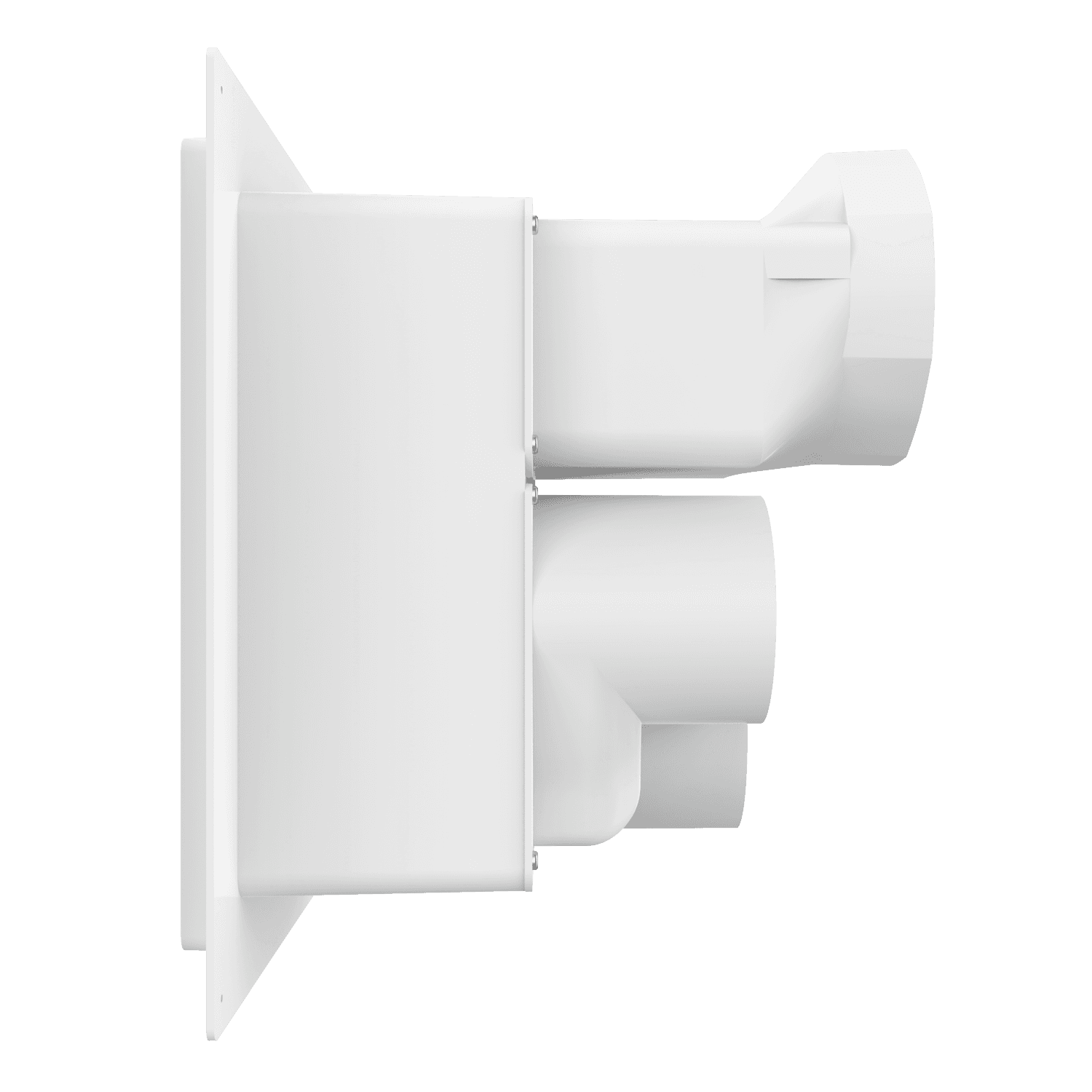 Triple exhaust box with dual 4″ and single 6″ duct ports in a vertical orientation. 6″ port is located at the top of the box. Features a fixed mounting flange ideal for use with stucco/siding and similar exteriors less than or equal to 7/8″ thick. Includes gravity backdraft dampers and a separator fin which prevents exhaust from mingling inside the box. Can be customized to fit unique field conditions.