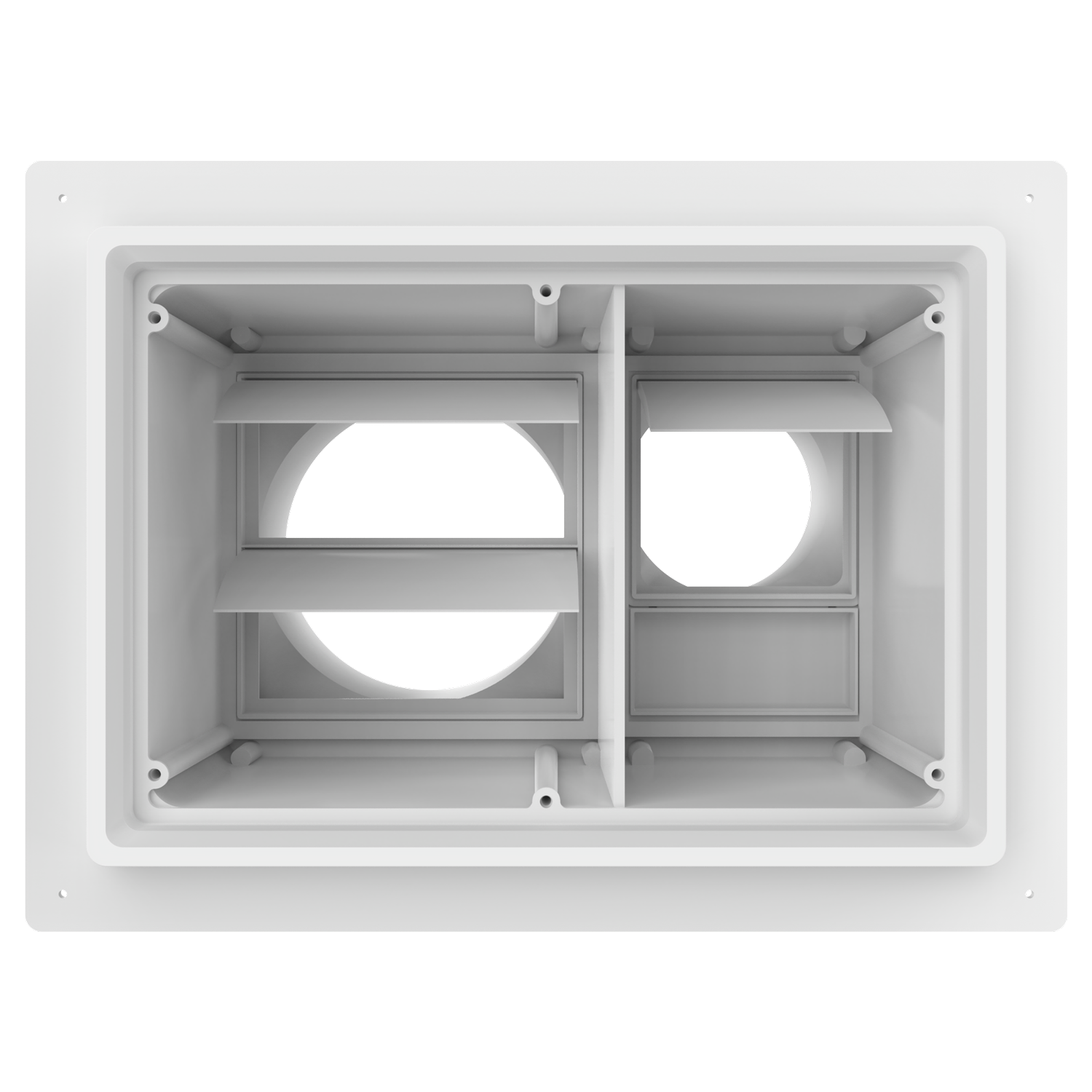 Double exhaust box with 6″ and 4″ duct ports in a horizontal orientation. 4″ port is located on the right side when viewing the box from the front. For use with stucco/siding and similar exteriors less than 7/8″ thick. Includes gravity backdraft dampers and a separator fin which prevents exhaust from mingling inside the box. Can be customized to fit unique field conditions.