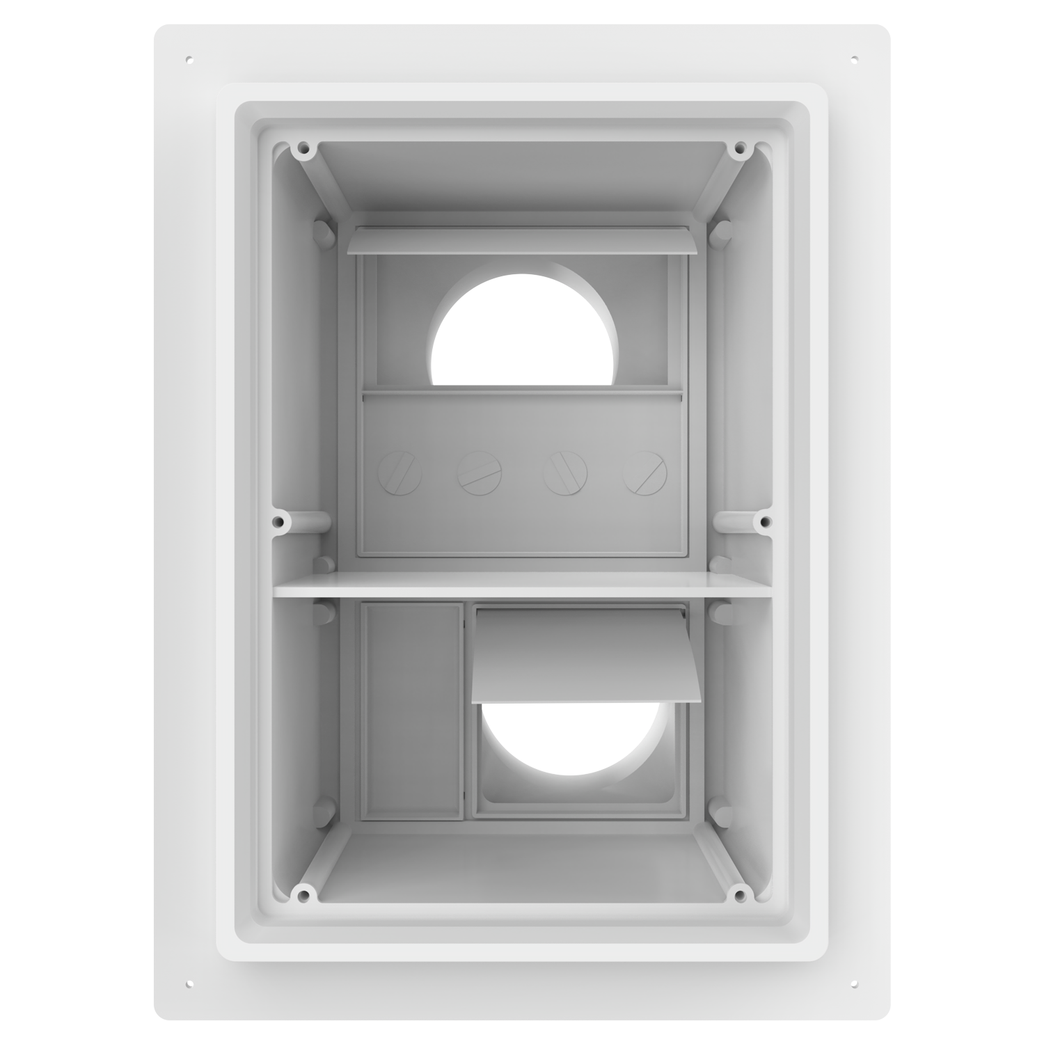 Double exhaust box with dual 4″ duct ports in a vertical orientation. For use with stucco/siding and similar exteriors less than 5/8″ thick. Includes gravity backdraft dampers and a separator fin which prevents exhaust from mingling inside the box. Can be customized to fit unique field conditions.