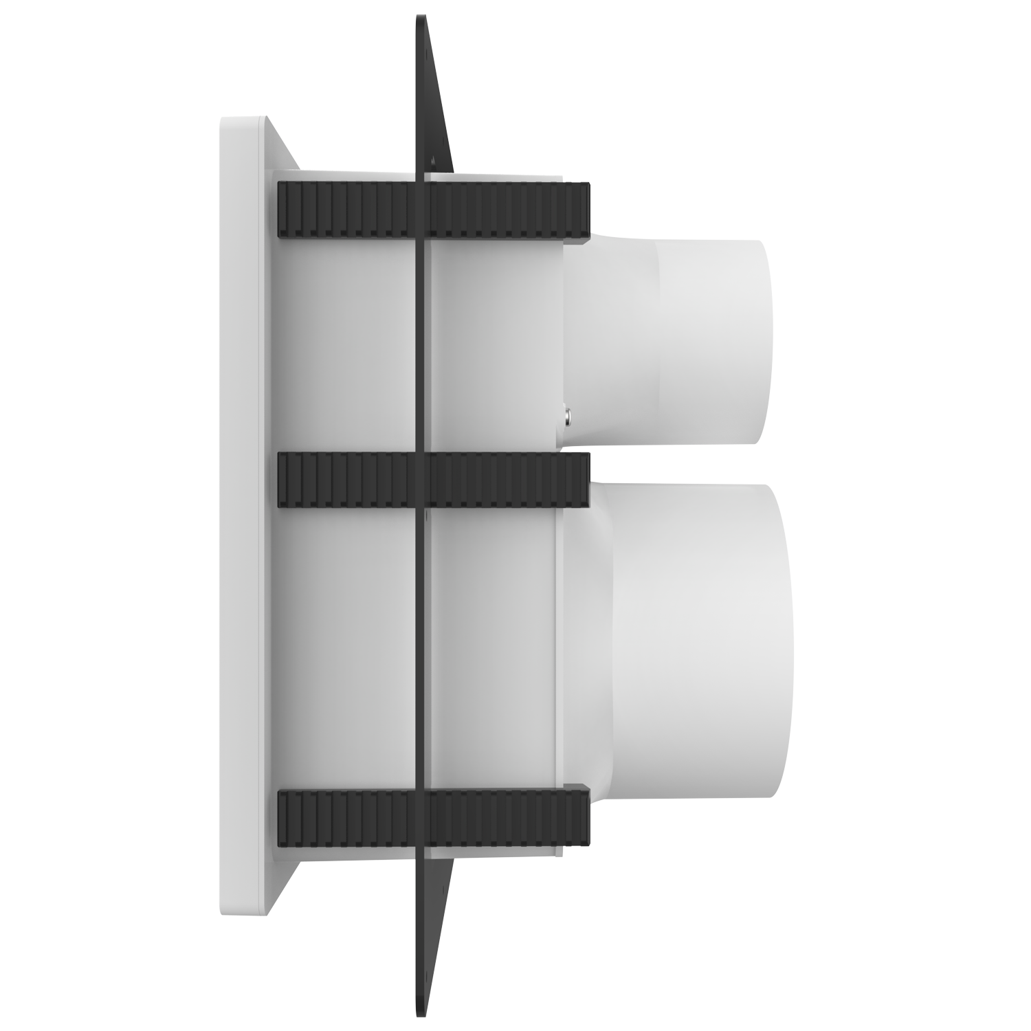 Double exhaust box with 4″ and 6″ duct ports in a vertical orientation. 4″ port is located at the top of the box. For use with brick/stone, EIFS, metal panel, stucco/siding greater than 7/8″ thick and similar exteriors. Includes adjustable mounting flange with an offset range of 1″-6″, gravity backdraft dampers and a separator fin which prevents exhaust from mingling inside the box. Can be customized to fit unique field conditions.