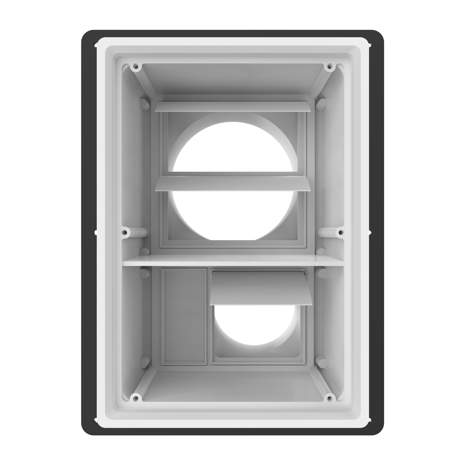 Double exhaust box with 6″ and 4″ duct ports in a vertical orientation. 6″ port is located at the top of the box. For use with brick/stone, EIFS, metal panel, stucco/siding greater than 7/8″ thick and similar exteriors. Includes adjustable mounting flange with an offset range of 1″-6″, gravity backdraft dampers and a separator fin which prevents exhaust from mingling inside the box. Can be customized to fit unique field conditions.