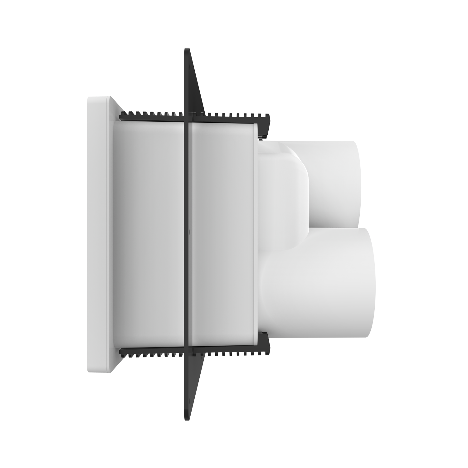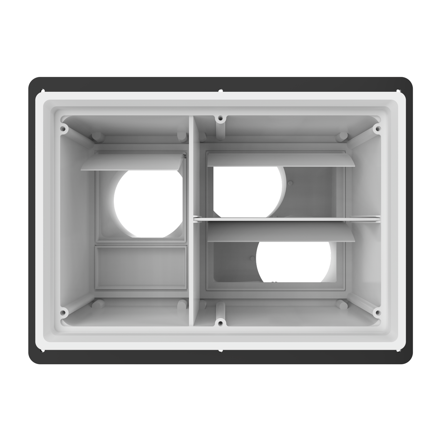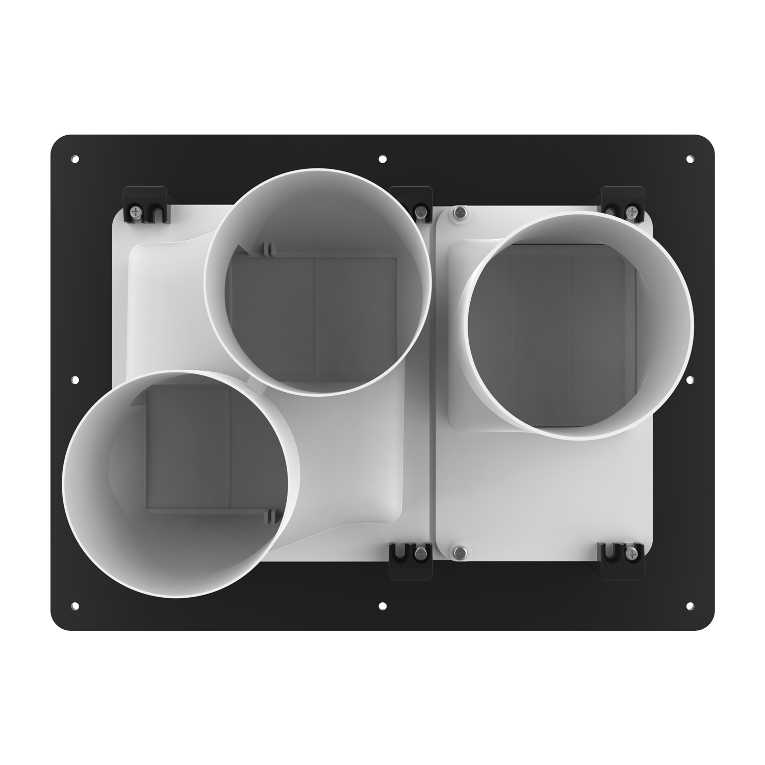 Triple exhaust box with three 4″ duct ports in a horizontal orientation. For use with brick/stone, EIFS, metal panel, stucco/siding greater than 5/8″ thick and similar exteriors. Includes adjustable mounting flange with an offset range of 1″-6″, gravity backdraft dampers and separator fins which prevent exhaust from mingling inside the box. Can be customized to fit unique field conditions.